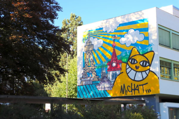 En 2018, Monsieur Chat a fait le mur pour retourner à l’école en créant cette fresque de 100 m2 sur le collège des Jeanneret. On y voit des rayons de soleil, la tour Eiffel, le clocher du Vieux Moutier, le drapeau neuchâtelois et 3 fameux sommets helvétiques : l’Eiger, le Mönch et la Jungfrau. Chapeau !