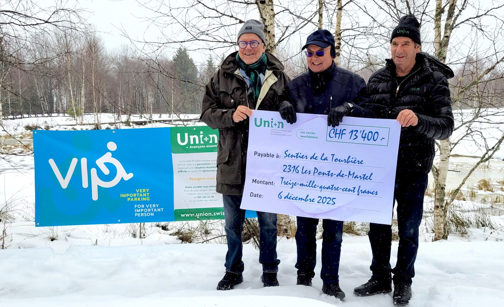 C’est une solidarité d’ampleur neuchâteloise qui s’est mise en marche pour venir en aide à l’association Maison de la Tourbière. Le 6 décembre dernier, les huit cercles cantonaux de la société philanthropique suisse UNION se sont associés au Lions Club et aux Soroptimist de La Chaux-de-Fonds pour participer au financement du réaménagement du sentier des tourbières des Ponts-de-Martel. Les philanthropes ont remis un chèque de 13 400 francs.