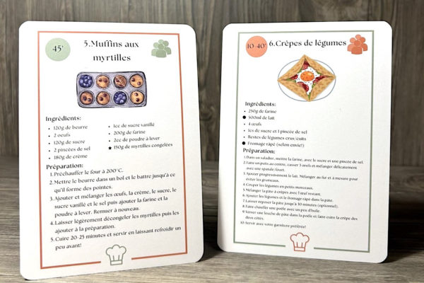 « Au départ, nous voulions élaborer un jeu de cartes classique. Après, nous étions partis sur l’idée de développer une application qui nous concoctait des recettes toute seule juste en prenant une photo du contenu de notre frigo. Mais c’était compliqué à réaliser et on a préféré mixer les deux idées pour aboutir à un jeu de cartes avec des recettes », raconte Inès Vuille. Le produit se présente sous forme de boîte contenant 40 cartes, 10 recettes sucrées et 30 salées, inspirées de livres de cuisine ou héritées de leurs familles.