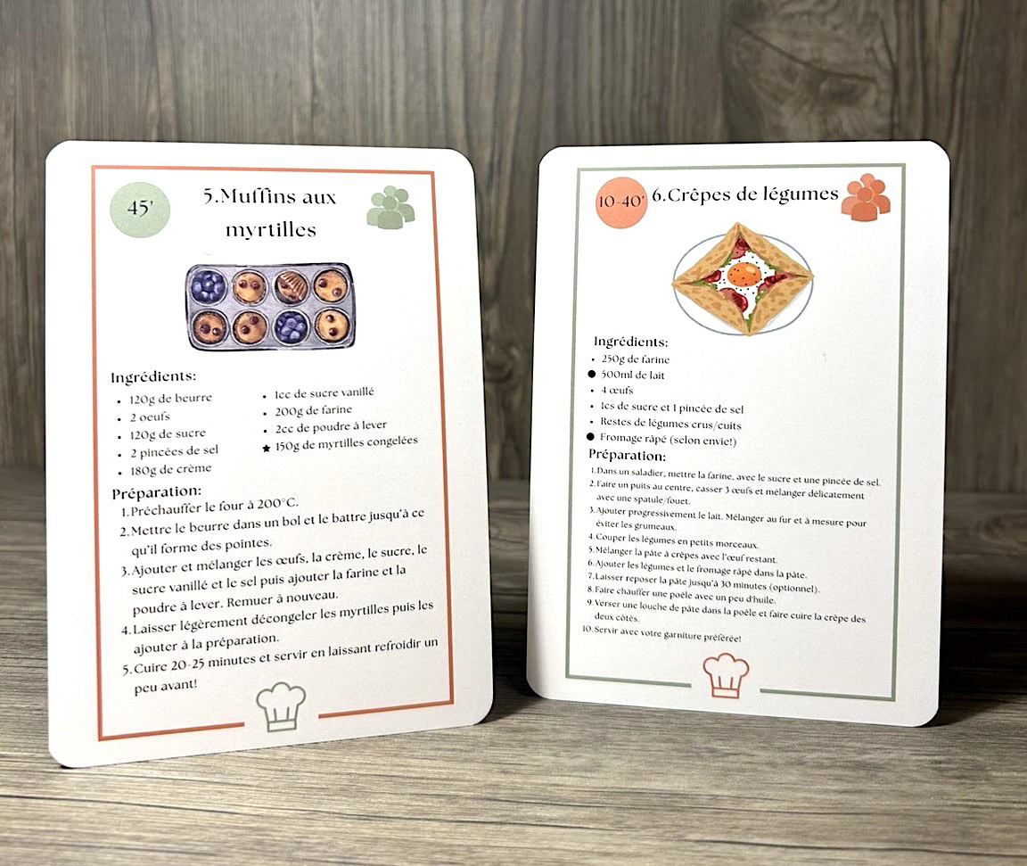 « Au départ, nous voulions élaborer un jeu de cartes classique. Après, nous étions partis sur l’idée de développer une application qui nous concoctait des recettes toute seule juste en prenant une photo du contenu de notre frigo. Mais c’était compliqué à réaliser et on a préféré mixer les deux idées pour aboutir à un jeu de cartes avec des recettes », raconte Inès Vuille. Le produit se présente sous forme de boîte contenant 40 cartes, 10 recettes sucrées et 30 salées, inspirées de livres de cuisine ou héritées de leurs familles.