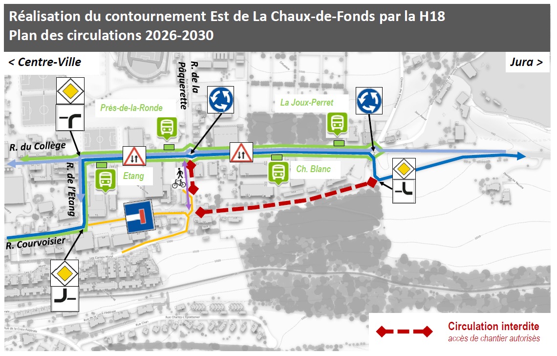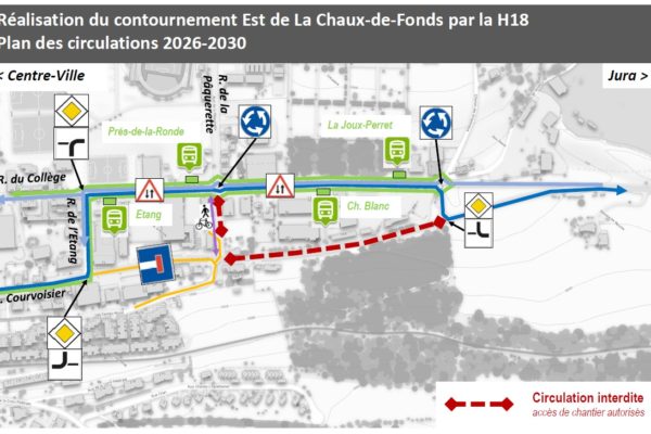 Autre évolutions notables : deux giratoires provisoires ont été réalisés en fin d’année 2025. Ils seront supprimés lors de l’ouverture du contournement Est. Quant aux transports publics, l’extrémité du tracé de la ligne 312 ne passe plus sur la rue Fritz-Courvoisier mais sur la rue du Collège. Deux nouveaux arrêts y ont été aménagés afin de maintenir le niveau de l’offre actuelle. Tous les changements mentionnés ci-dessus sont provisoires et dureront jusqu’à l’achèvement complet du contournement au plus tard. Le service des ponts et chaussées met tout en œuvre pour minimiser l’impact de cette inévitable fermeture de route et remercie toutes les usagères et tous les usagers de bien vouloir se conformer à la nouvelle signalisation.