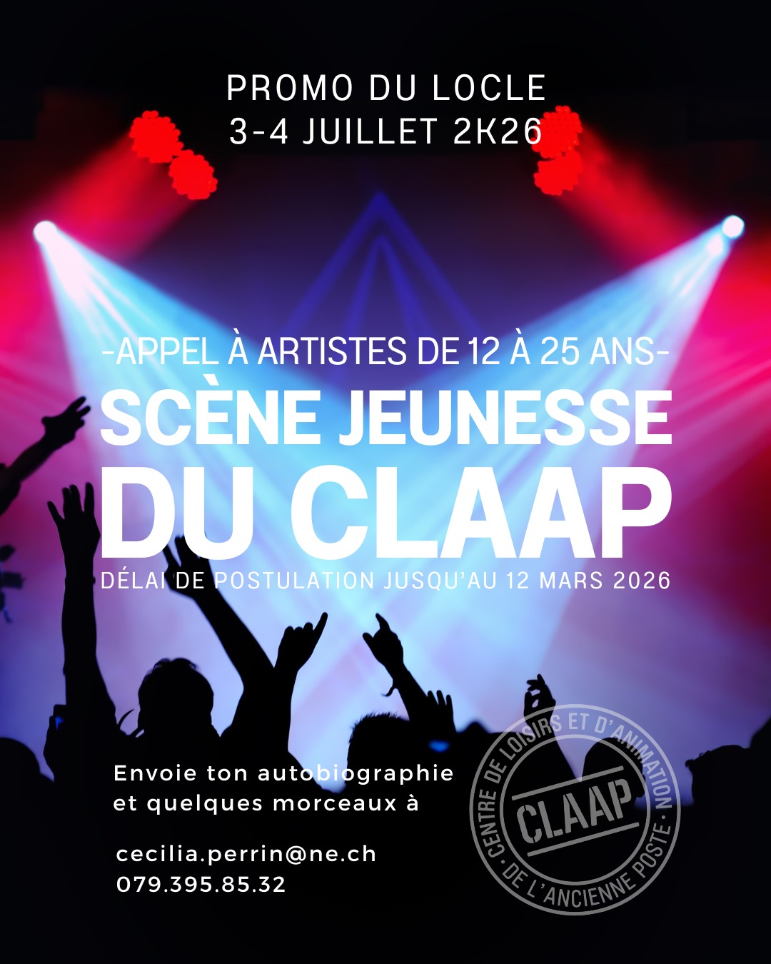 Dans le cadre des Promos du Locle 2026, qui auront lieu les 3 et 4 juillet 2026, le CLAAP du Locle (Centre de loisirs et d’animation de l’Ancienne Poste) proposera une scène jeunesse, intégrée au festival des Promos du Locle, afin de créer un espace dédié aux jeunes. Des jeunes artistes de 12 à 25 ans sont activement recherchés. Quel type de profil peut coller ? Toutes celles et tous ceux qui ont envie de se produire sur scène aussi bien en chant qu’en danse et qu’en performance diverse et variée. Aucune expérience de scène n’est requise : les jeunes débutant·e·s sont les bienvenu·e·s et même encouragé·e·s à participer. C’est autant l’expérience de la scène que la performance en elle-même que cherche à promouvoir le CLAAP.