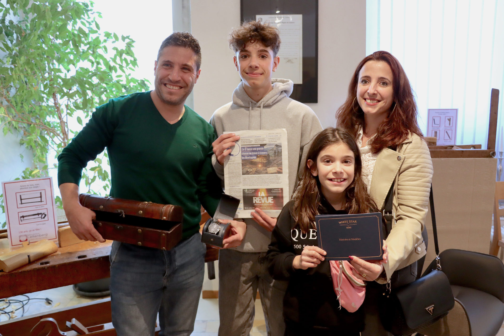 À l’intérieur, Bertrand et Brigitte Leitenberg sont là pour les accueillir. Tiens, il y a aussi Cédric Berruex, le propriétaire de la marque de montres White Star, fondée en… 1895 aussi par Henri Weiss (en lien avec la famille Blanc peut-être ?) « Les parties les plus historiques du magasin se trouvent à cet étage et en-dessous », aiguillonne Brigitte. « Deux ici et 2 en bas », ordonne gentiment le jeune Rafael. Au bout de 2 minutes de recherche infructueuse, les 4 membres de la famille se retrouvent au sous-sol. Rafael se dirige vers le vieil établi d’époque présenté en magasin. Ça chauffe… « Je l’ai trouvé », explose alors Rafael sous les applaudissements. Reste à mettre le code dans le cadenas. Est-ce que c’est le bon ?