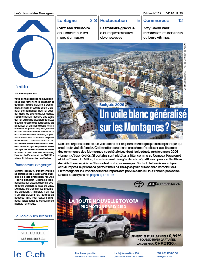 Dans les régions polaires, un voile blanc est un phénomène optique atmosphérique qui rend toute visibilité nulle. Cette notion peut sans problème s’appliquer aux finances des communes des Montagnes neuchâteloises dont les budgets prévisionnels 2026 viennent d’être révélés. Si certains sont plutôt à la fête, comme au Cerneux-Péquignot et à La Chaux-du-Milieu, les autres sont plongés dans le négatif avec près de 6 millions de déficit envisagé à La Chaux-de-Fonds par exemple. Surtout, le flou économique actuel impose la prudence partout mais ne rime pas pour autant avec immobilisme.